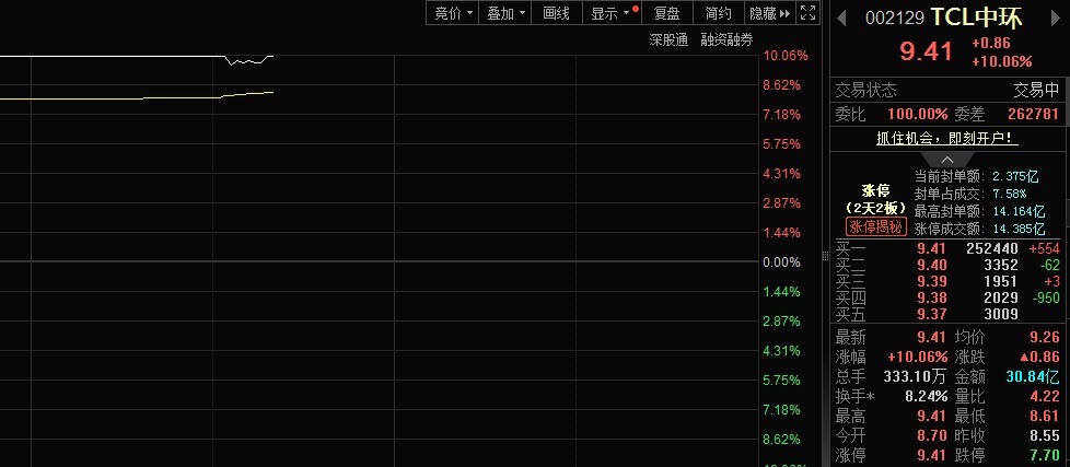 9月25日,TCL中环(002129)股价再度大涨。截至发稿环球策路,股价报9.41元/股,实现涨停。